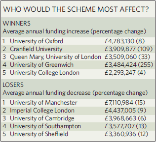 However, as Jim Giles points out in his assessment in the June 22 Nature any of the five different models examined in the consultation paper, "...have roughly the same effect of boosting universities that are good at bringing in money, such as those with the research capacity to attract significant funding from medical charities (for example, University College London) or industry (such as Cranfield University), [while] taking money from those for whom such activity is a smaller component of their total income (see table).
